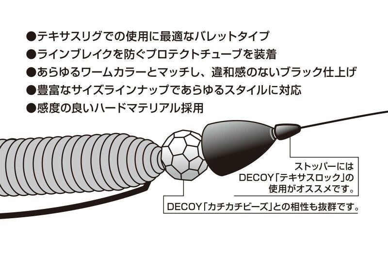 Type Bullet Sinker von Decoy kommen als Gewicht beim Fischen mit Texas und Carolina Rigs zum Einsatz. Um Schäden an der Vorfachschnur durch das darauf gleitende Metall auszuschließen, wurde die Innenführung dieser Patronenbleie mit einem Kunststoffröhrchen versehen. Weiterhin überzeugen die Bullets von Decoy durch ihre gute Verarbeitung und eine hochwertige, schön unauffällige Lackierung.