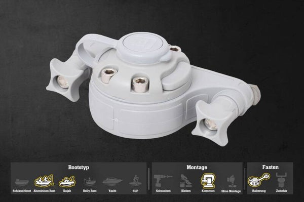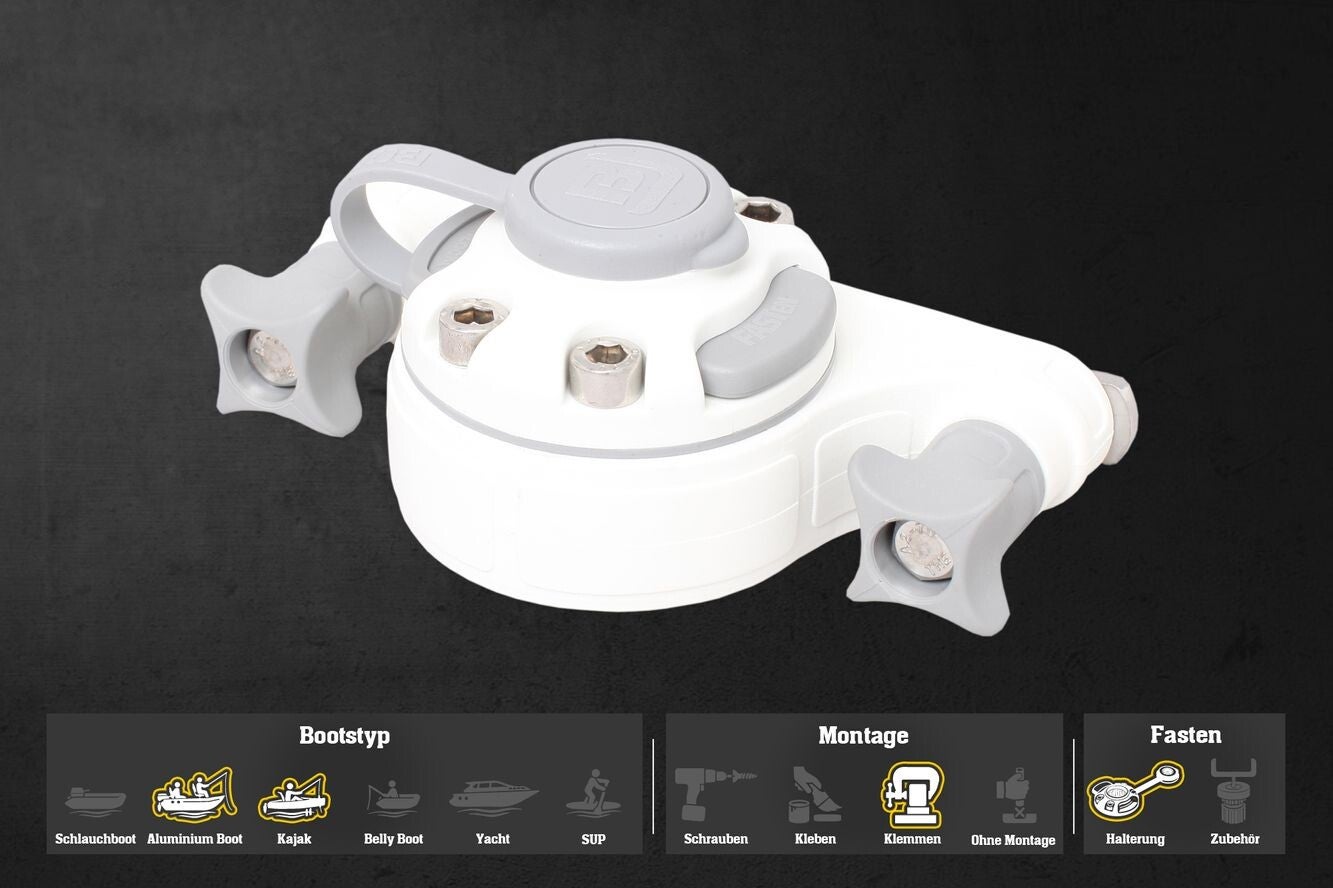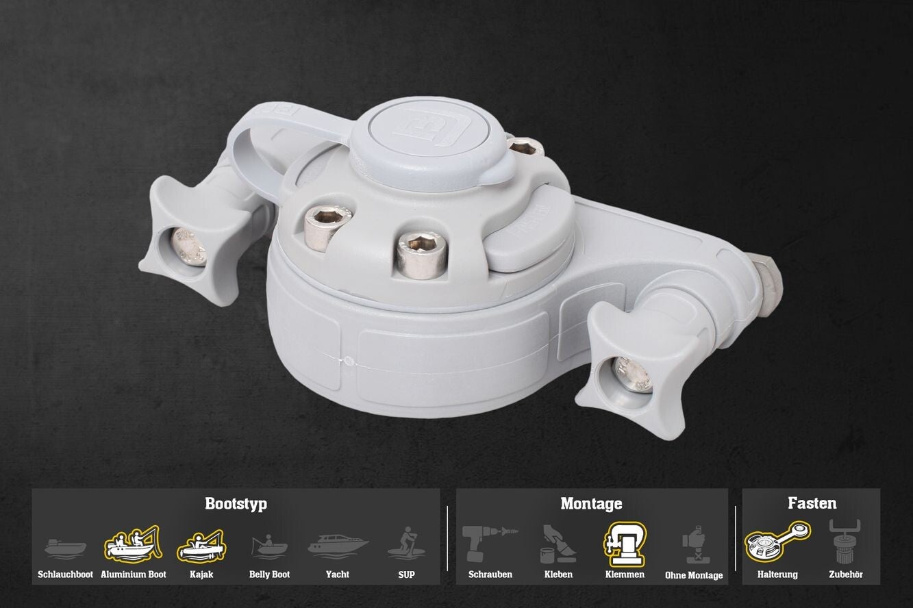 Das Halterungssystem ist robust und zuverlässig für gängiges Zubehör wie Rutenhalter oder Echolote. Bitte beachten Sie jedoch: Die Stabilität richtet sich nach der Schiene am Boot. Aluminium und Metallschienen sind belastbarer als Kunststoffschienen. Für Zubehör mit sehr hoher Belastung empfehlen wir eine feste Verschraubung, um eine maximale Sicherheit zu gewährleisten.